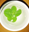 そのまま捨てる気には到底なれず、ぐい飲みに水を張り、願いを込めて四つ葉ちゃんをそっと沈めました。